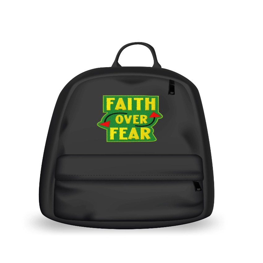 - DESIGN: Bold 'Faith Over Fear' embroidered patch featuring vibrant yellow text on green background with red arrow accents