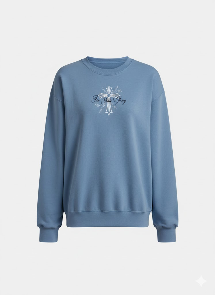 Our For Your Glory Sweatshirt is a timeless piece. Simple but message is powerful. Made with embroidery with a cross and floral branches around.