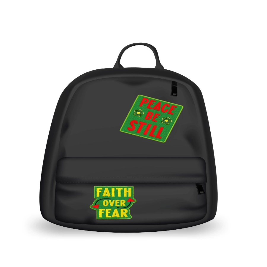 - DESIGN: Green embroidered patch featuring 'PEACE BE STILL' text in red letters with decorative yellow flower accents